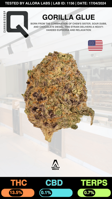 Gorilla Glue, also known as GG4, is a powerful hybrid strain that has taken the cannabis world by storm with its high THC levels and sticky resin production. Born from the combination of Chem's Sister, Sour Dubb, and Chocolate Diesel, this strain delivers a heavy-handed euphoria and relaxation, making it a favorite among those seeking a potent experience.