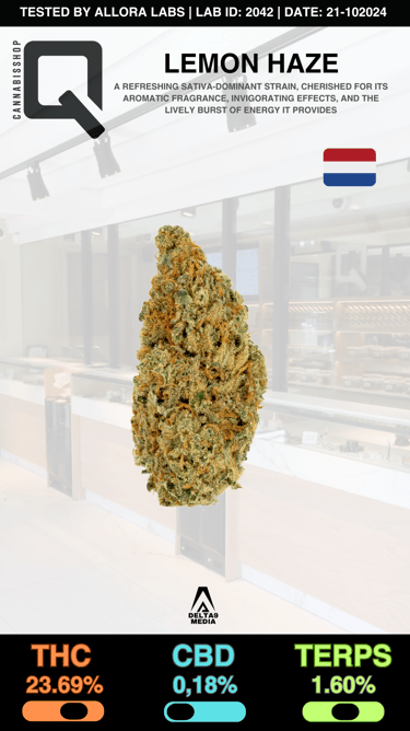 True to its name, Lemon Haze exudes a strong citrus aroma, dominated by fresh lemon with a hint of earthiness. This tangy scent is invigorating and can uplift the senses even before the first inhale, promising a refreshing and enjoyable experience.