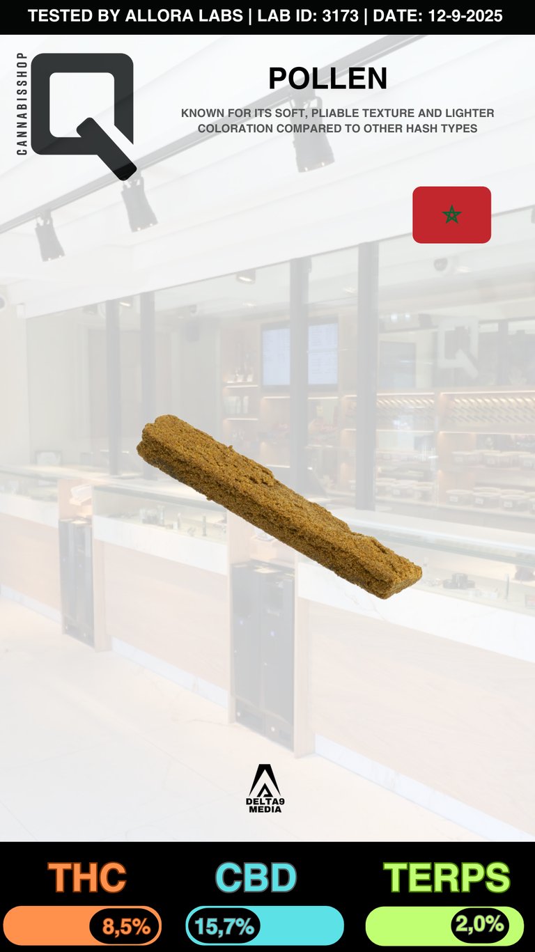 Polm, also known in Dutch as "Pollen," is a revered hash variety originating from traditional hash-producing regions like Morocco. Known for its soft, pliable texture and lighter coloration compared to other hash types, Polm is appreciated for its subtlety in both flavor and effect. This hashish is made by collecting and pressing the resin glands (trichomes) of the cannabis plant, resulting in a product that embodies the essence of the plant in a more mellow form. Polm is a favorite among connoisseurs and casual users alike, seeking a smooth, clean high and a genuine cannabis experience.
