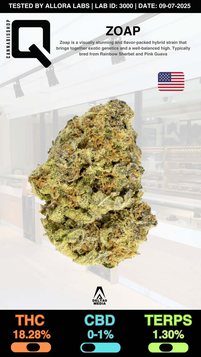 Zoap is a flavorful, exotic hybrid that stands out for its unique aroma, balanced effects, and vibrant appearance. Whether you're seeking creative stimulation, a gentle mood lift, or just want to enjoy some of the finest modern cannabis has to offer, Zoap delivers a smooth and refreshing experience that’s as memorable as its name. Ideal for social sessions, solo relaxation, or enhancing everyday moments with a clean and colorful high.